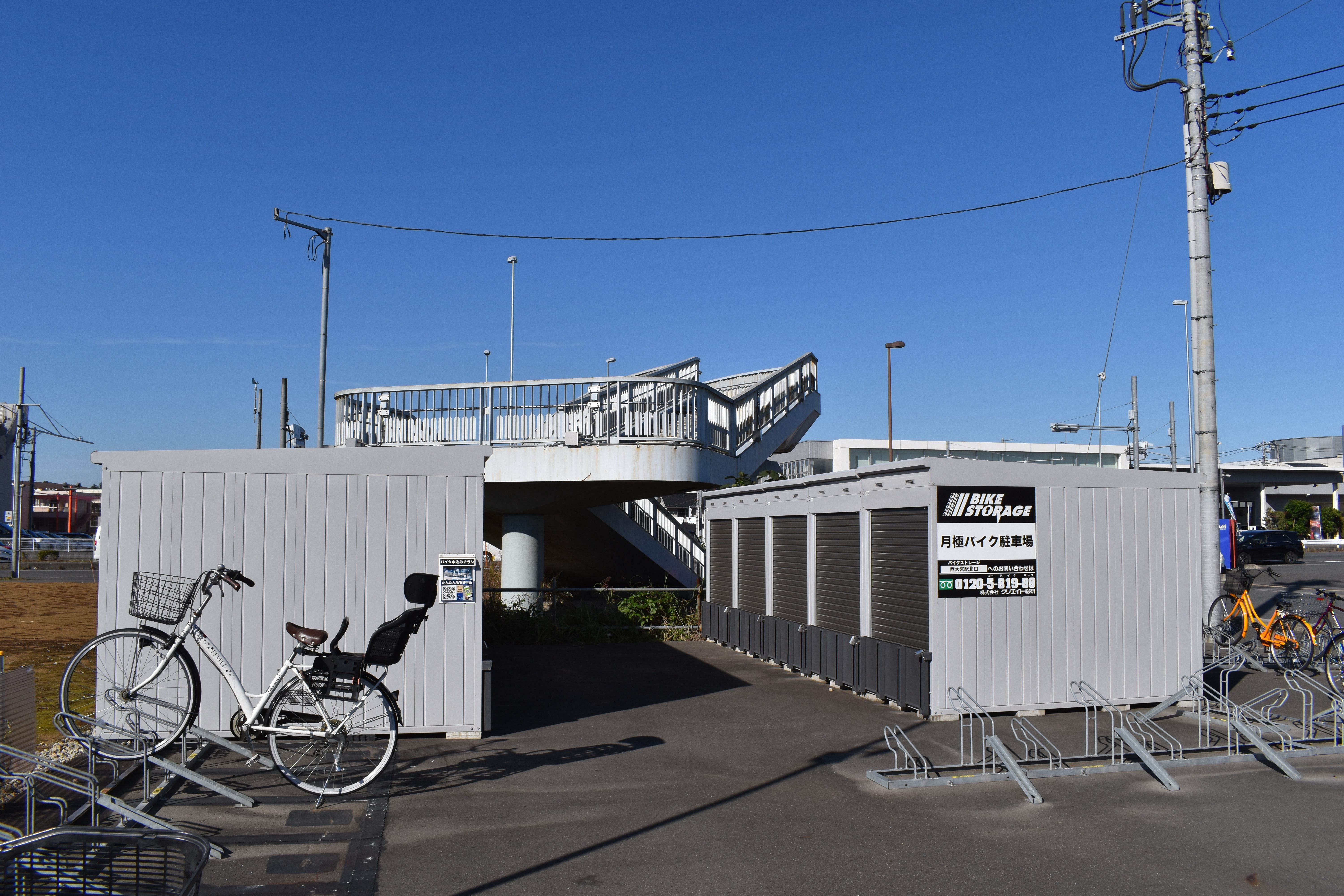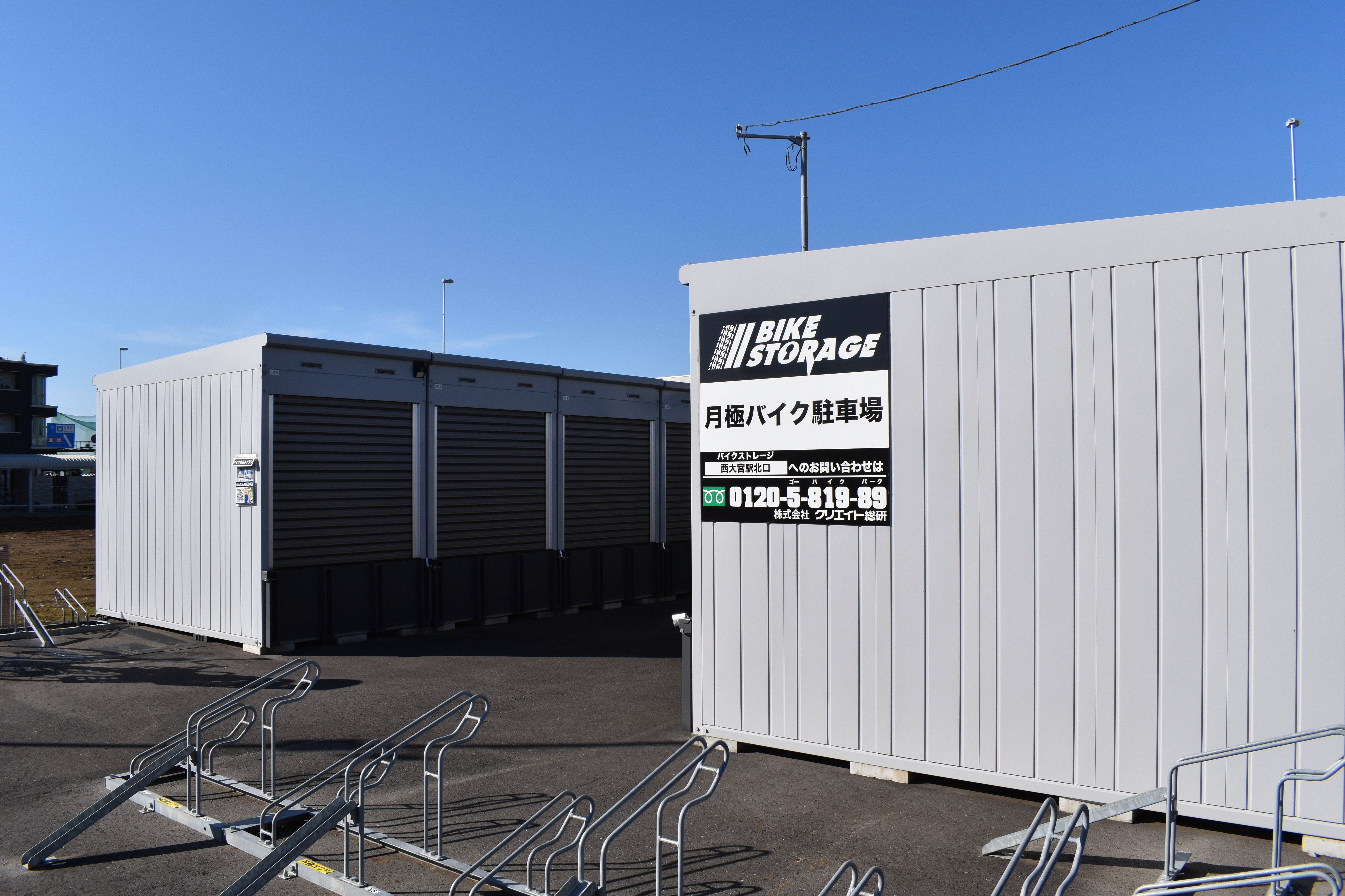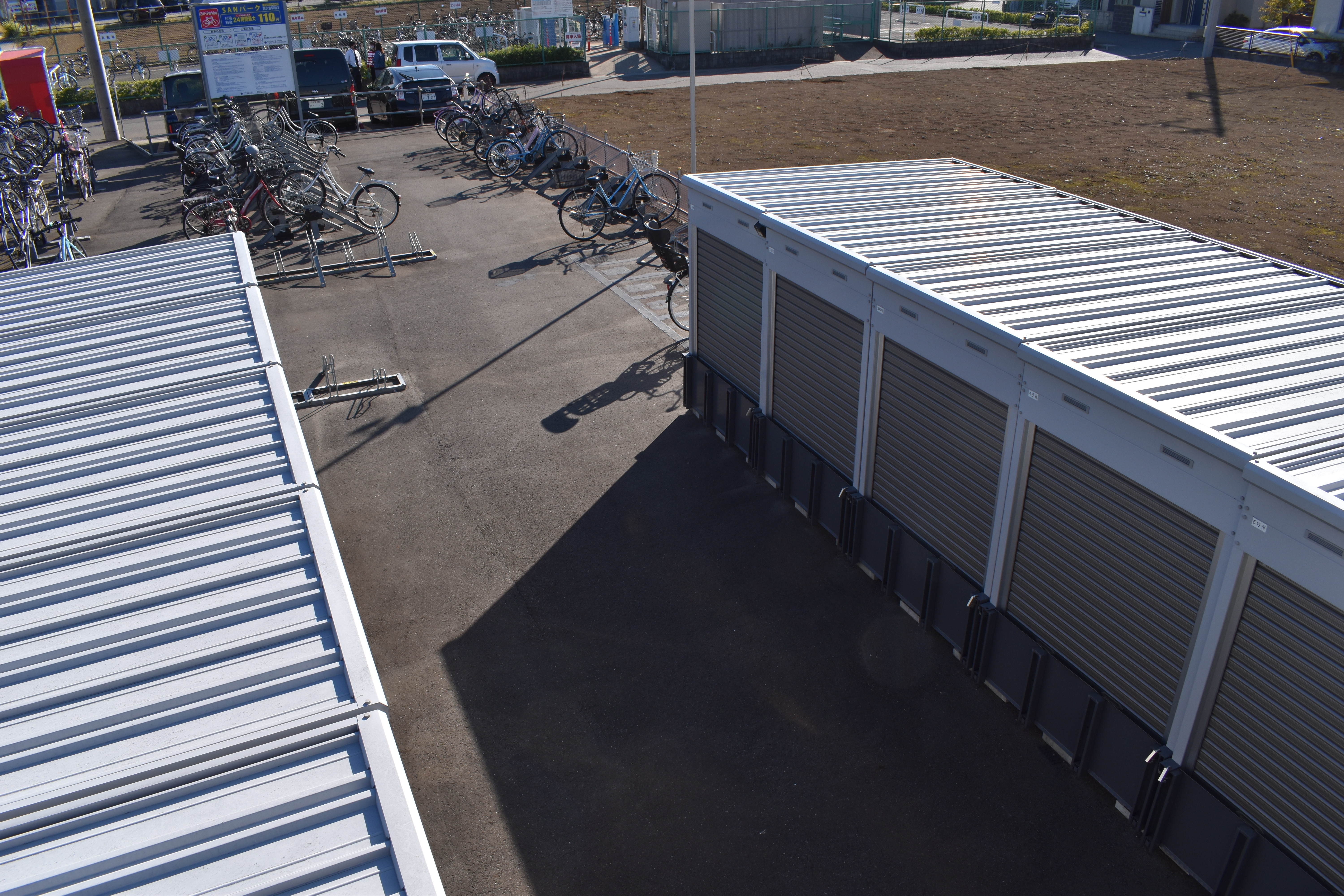 駅近くの場所で駐輪場として運用を計画した場所だが敷地が大きく一部のスペースをバイクガレージとして活用を行った。場内の配置としては接道より遠く背面は幹線道路・歩道に面し利用通路は駐輪場の通路を共有し有効活用を計った。
