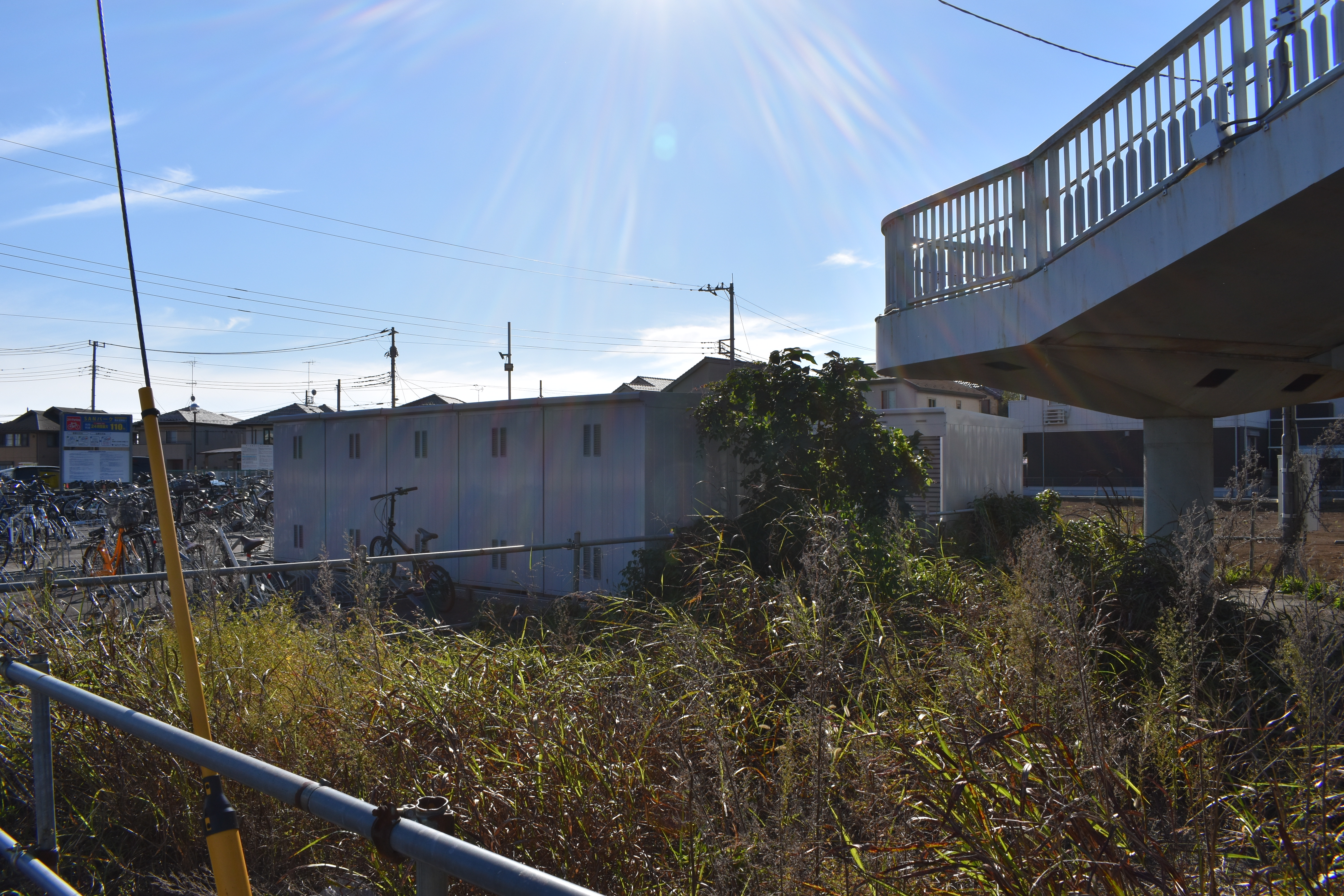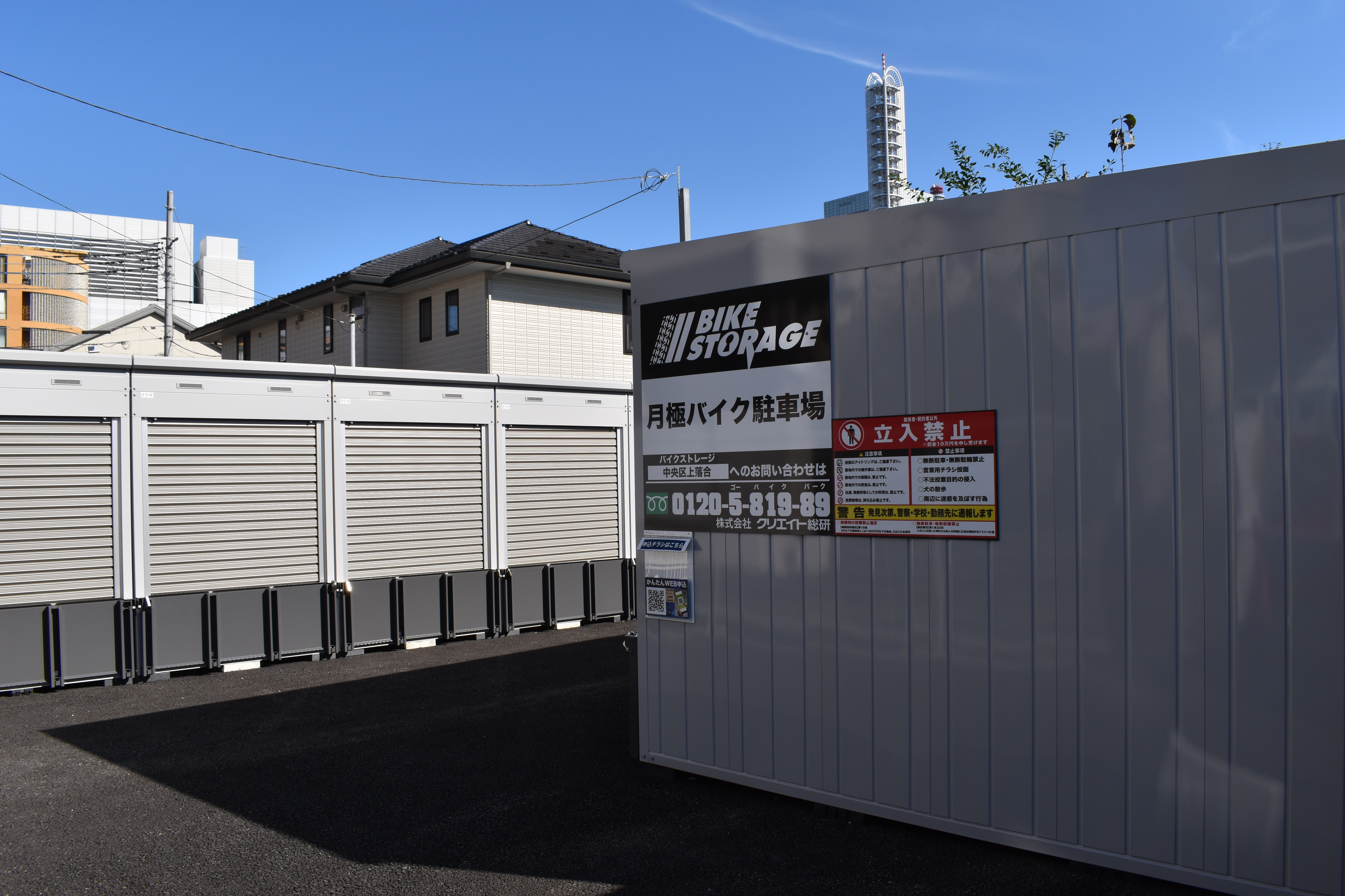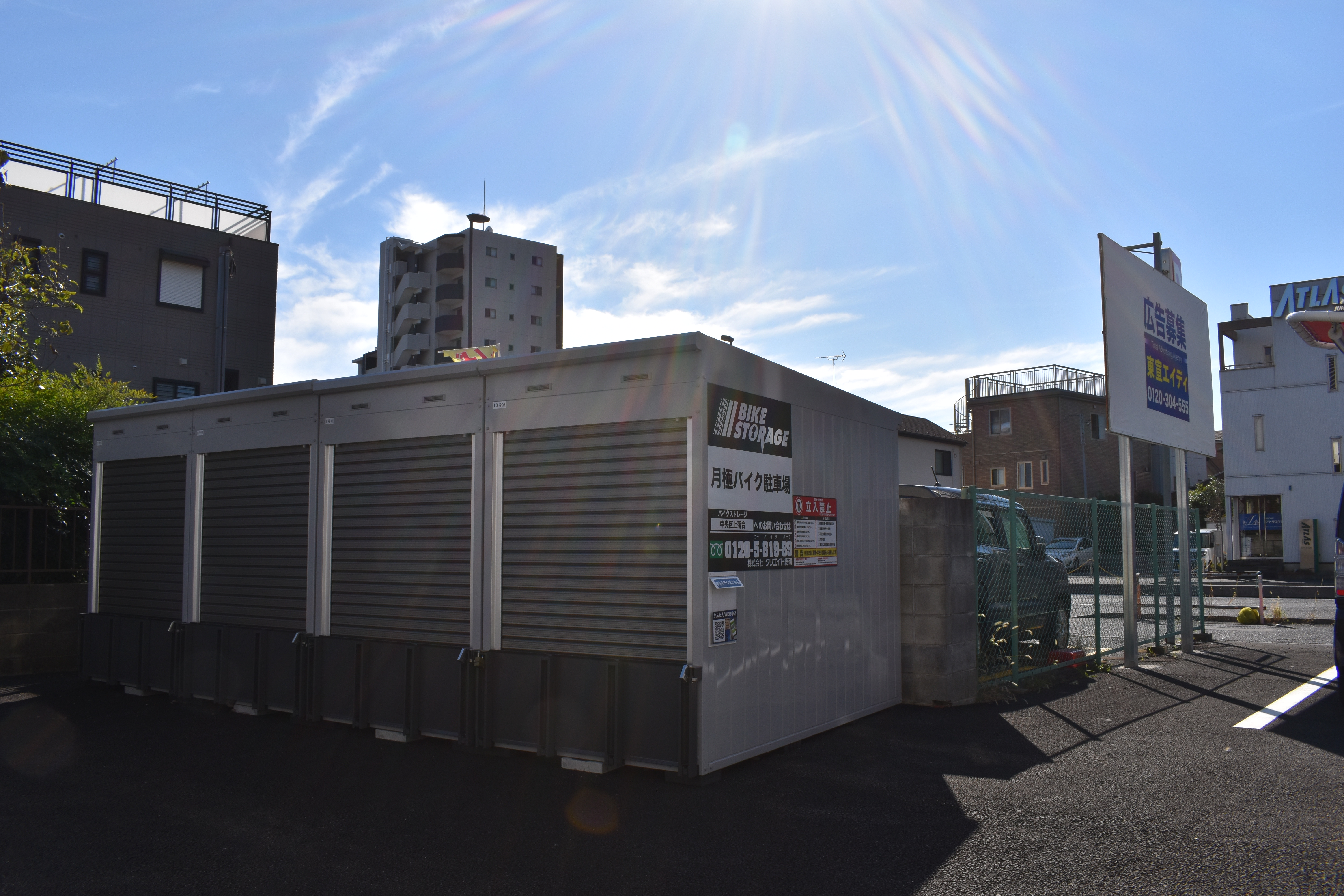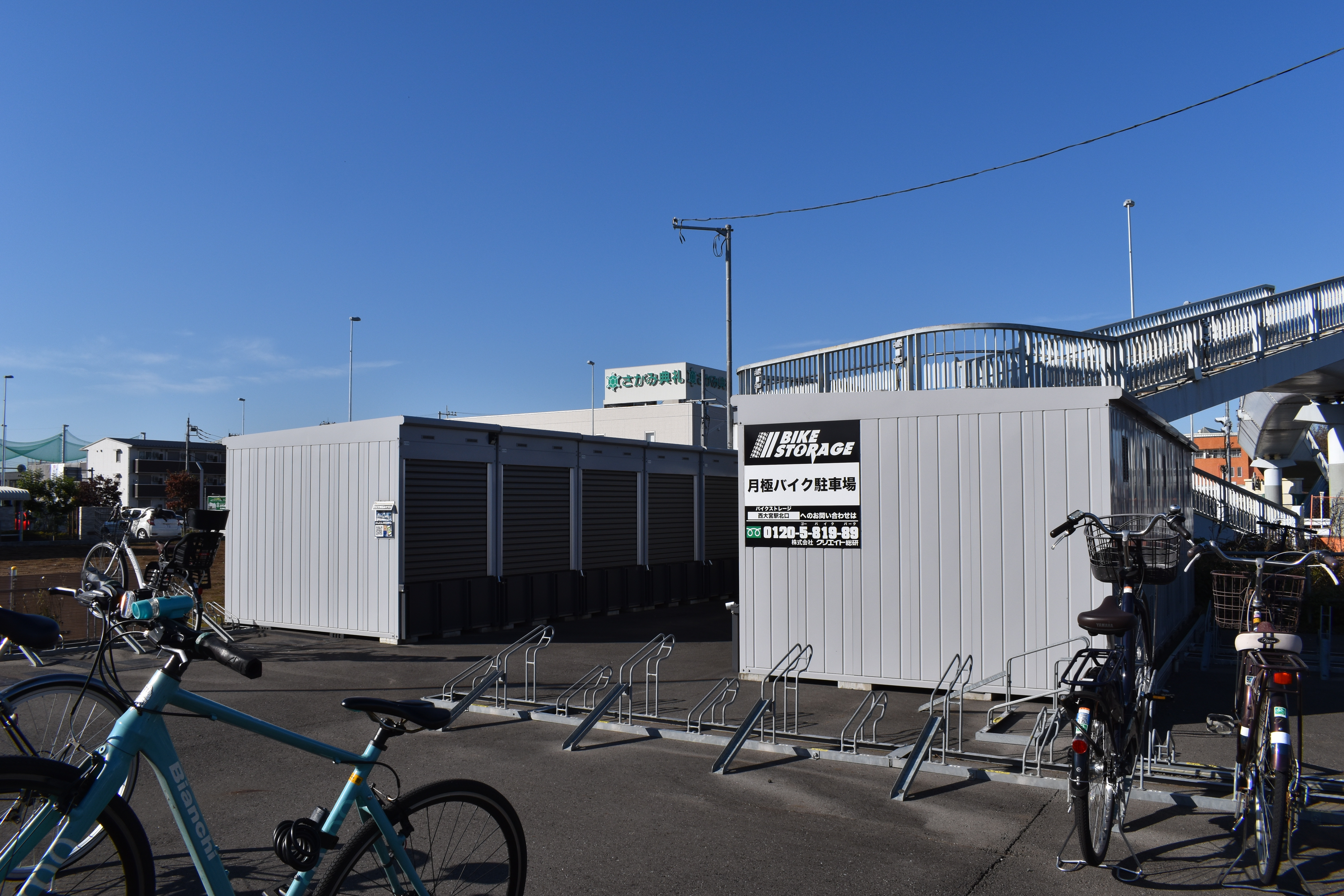 駅近くの場所で駐輪場として運用を計画した場所だが敷地が大きく一部のスペースをバイクガレージとして活用を行った。場内の配置としては接道より遠く背面は幹線道路・歩道に面し利用通路は駐輪場の通路を共有し有効活用を計った。