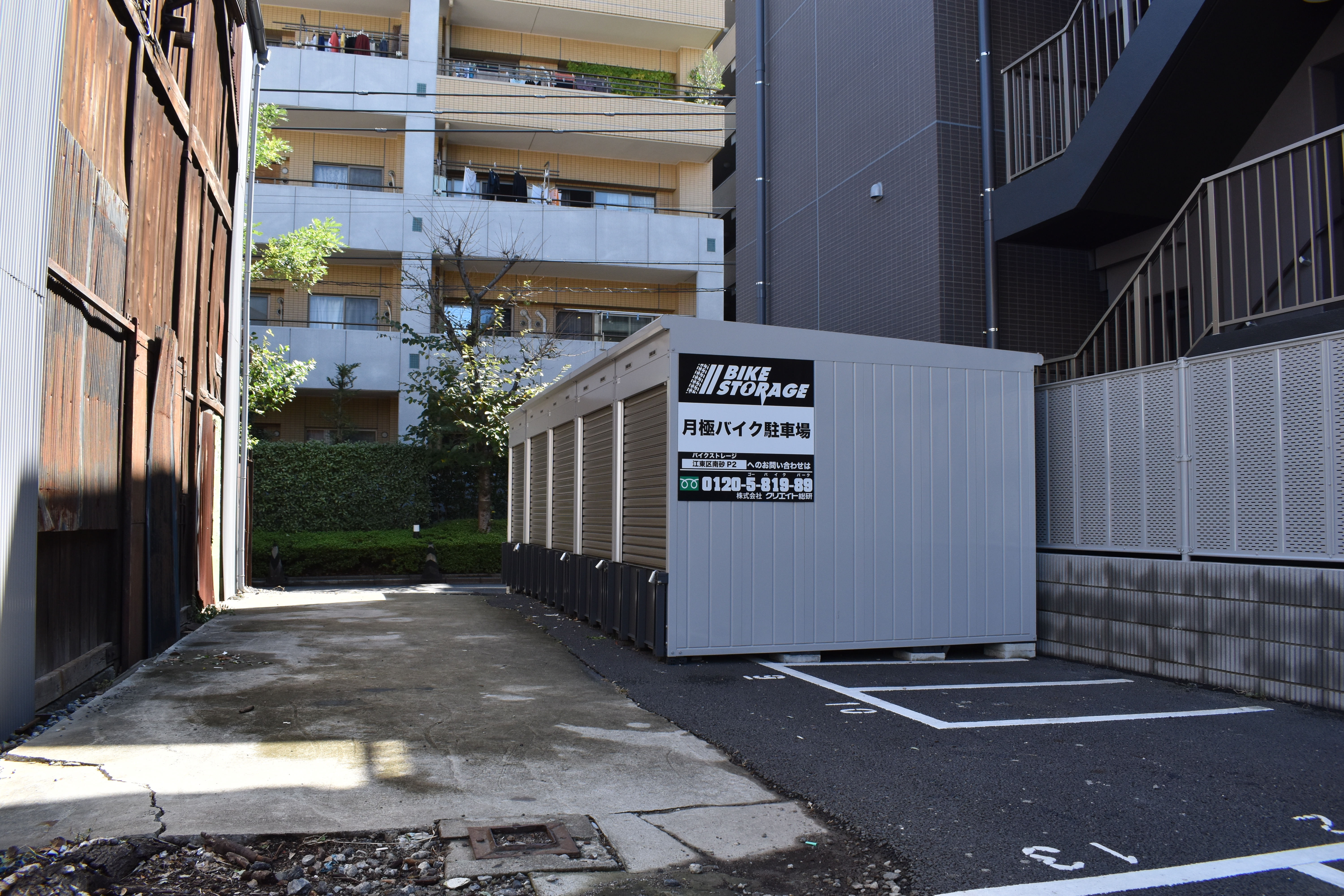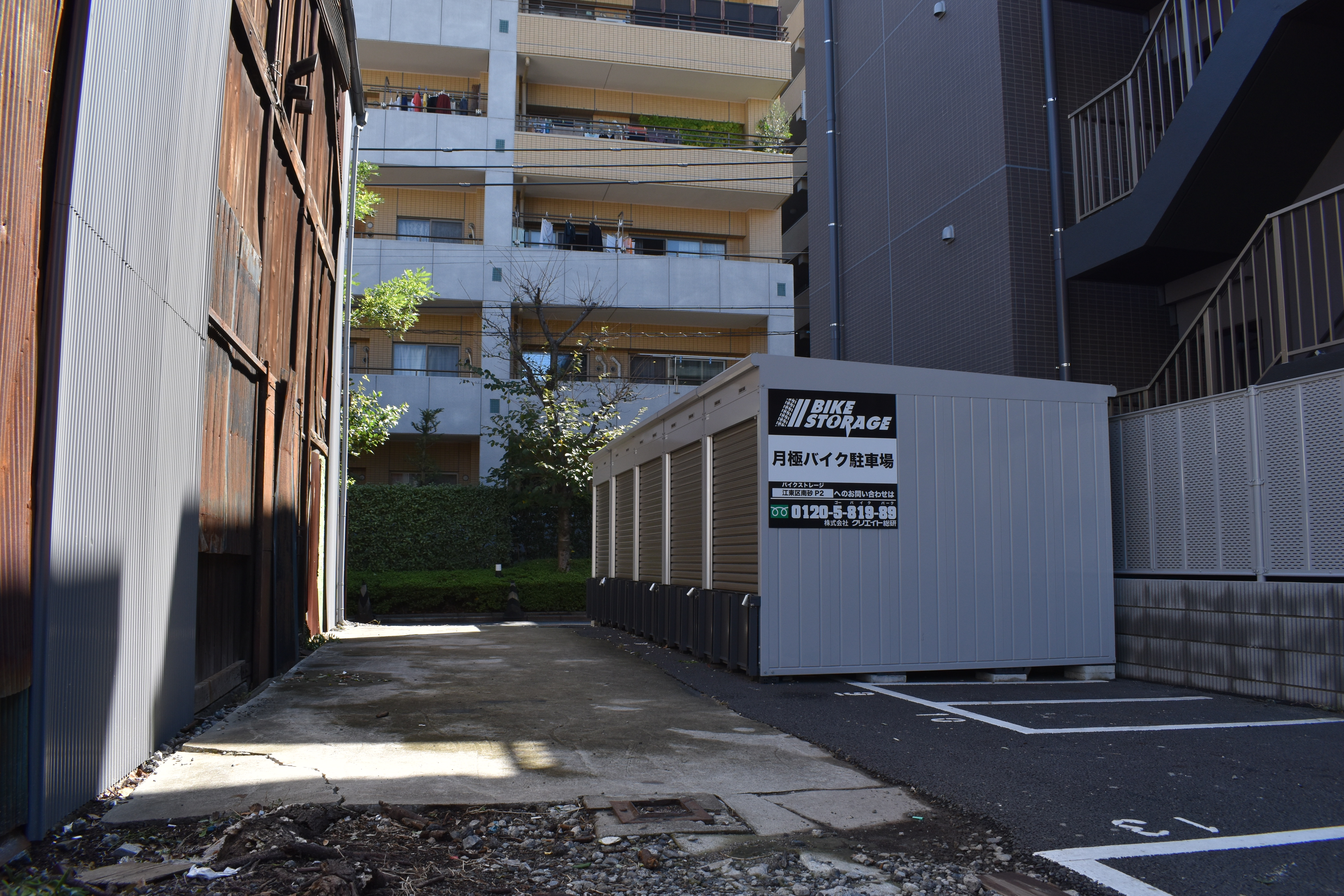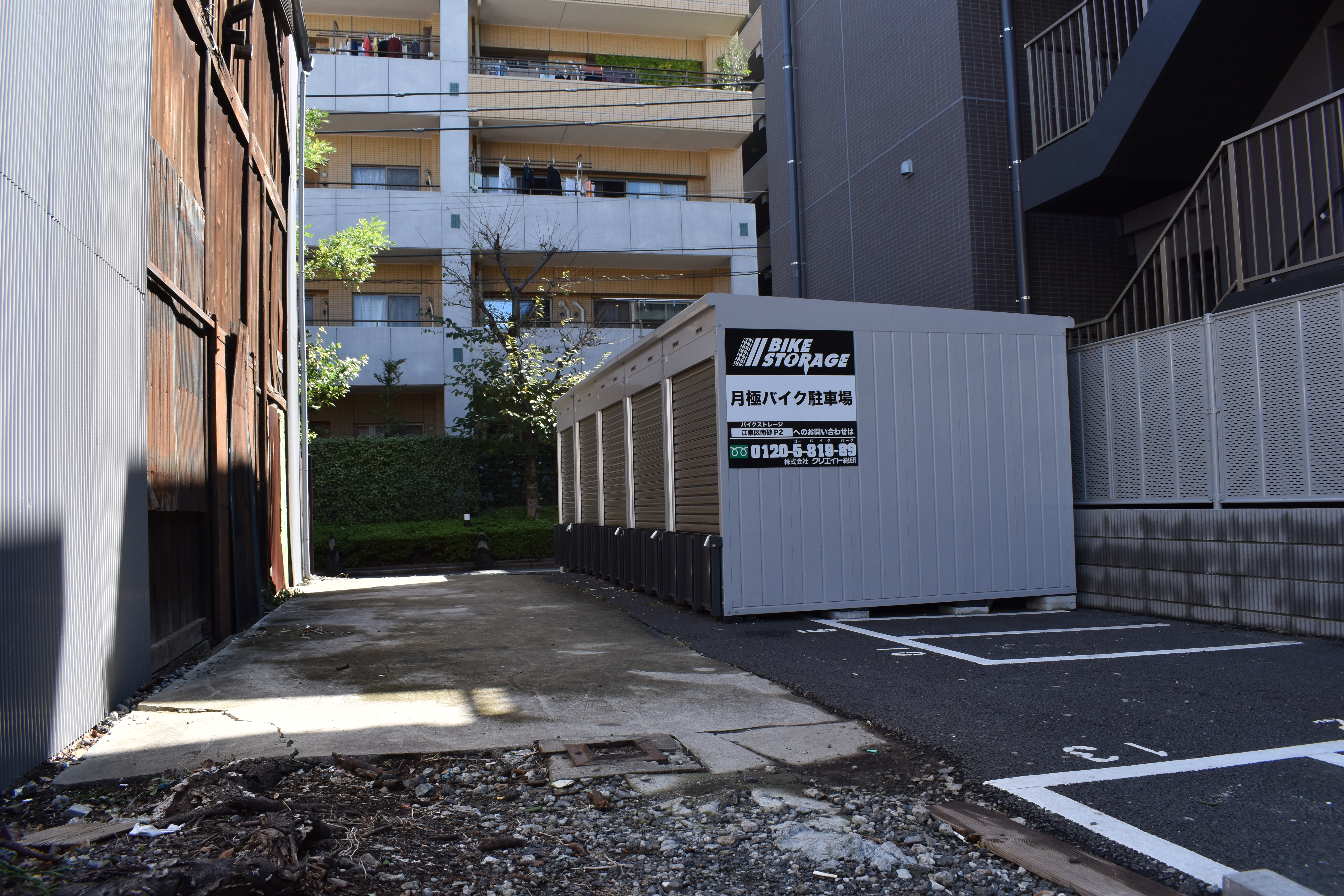 倉庫として利用している敷地一部を解体しバイク駐車場を運営。さらにバイク駐車場の一部をバイクガレージ式駐車場に変更を行った。既存倉庫利用の際、解体したスペースが四輪駐車場には狭くバイク駐車場利用する事により有効活用が行えた。